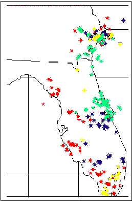 In the third period all birds6.1seem to have stayed at the same locations without larger excursions. Interestingly there is a change in location in two birds (red and blue) moving further north, and when examining the plot for the bird indicated in green, the same is true yet to a much smaller amount. This may well indicate that this should be considered as a fourth period in the data. The fifth period of time starts with the spring migration back to the north. It is interesting that the woodstork which already made a longer stay during the migration southwards again stays for some time at a latitude in between the winter residence and its breeding site. Another thing that is noteworthy is that it looks as if the spring migration takes a longer time than the migration in fall. In European regions the inverse is normally observed for birds. The spring migration is shorter than the fall migration.