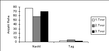 In der Nacht wurden auf der gesamten in Abbildung 2 gezeigten Beobachtungsfläche von ca. 2 km2 im Durchschnitt 68.3 Rehe pro Durchgang gesehen. Im Vergleich dazu wurden am Tag jeweils nur rund 3 Rehe beobachtet (Abbildung 5). Dieser Unterschied veranschaulicht eine deutliche Ausweichreaktion der Rehe am Tag weg von den grösseren Wegen. Trotz der kleinen Stichprobe am Tag zeigt sich eine Tendenz, dass Rehgruppen am Tag in steileren Lagen beobachtet wurden (MWU, n1=116, n2=7, z=-1.74, p=0.08). Dagegen lässt sich kein Unterschied in der Höhenverteilung nachweisen (MWU, n1=116, n2=7, z=-0.699, p=0.48).