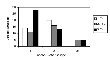 Bei der Hangneigung zeigte sich eine Tendenz zu steileren Gebieten im Übergang von der ersten (Durchschnitt 9.3) zur zweiten Aufnahme (Durchschnitt 12.0). Ebenfalls nur als Tendenz erwies sich eine Abnahme der Gruppengrösse. Die durchschnittliche Anzahl Rehe pro Gruppe sank von 2.0 in der ersten auf 1.5 Tiere in der dritten Aufnahme, was darauf zurückzuführen ist, dass vermehrt Einzeltiere und weniger Zweiergruppen zu beobachten waren (Abbildung 6).