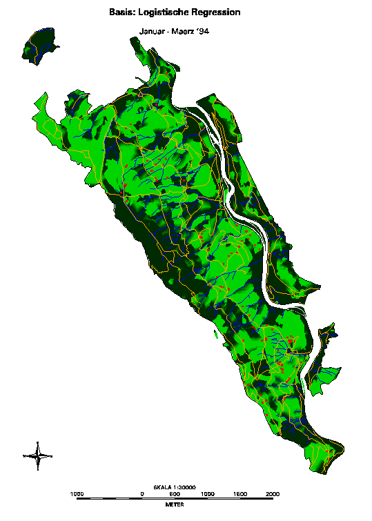 Abbildung 8: Resultat der Extrapolation mittels logistischer Regression. Grüne Bereiche geben eine hohe Wahrscheinlichkeit von Rehvorkommen, schwarze Bereiche eine kleine Wahrscheinlichkeit an. Eingezeichnet sind zudem die Beobachtungsorte (rot) und als Orientierungshilfen das Gewässernetz (blau) und das Wegnetz (braun).