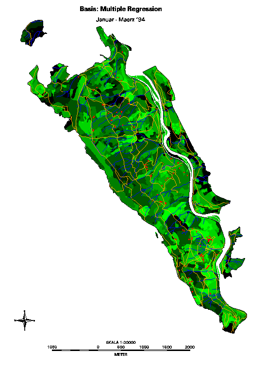 Abbildung 9: Resultat der Extrapolation mittels linearer Regression. Hellgrüne Bereiche bezeichnen berechnete Gebiete mit hohen Dichten, schwarze Bereiche solche mit kleinen bzw. Dichten von 0. Zudem sind die Beobachtungsorte (rot) das Gewässernetz (blau) und das Wegnetz (braun) als Orientierungshilfen eingezeichnet.