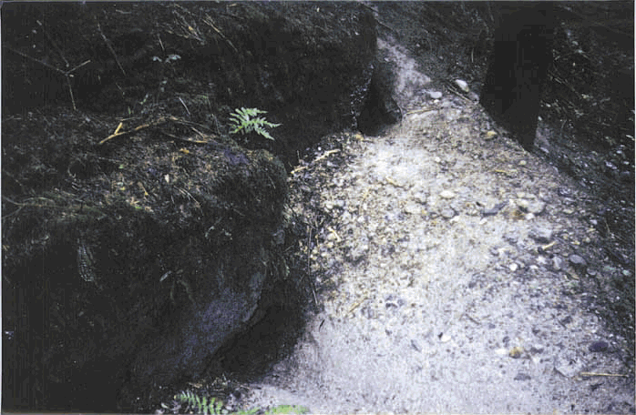 Fig. 4: Badger sett dug "under a boulder". Note the mound of excavated soil in front of both entrances and the digging furrow leading from the lower entrance across the spoil heap.