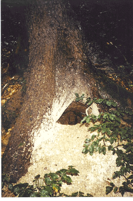 Fig. 5: Badger sett dug "under a spruce tree". Note the mound of excavated soil in front of the entrance.