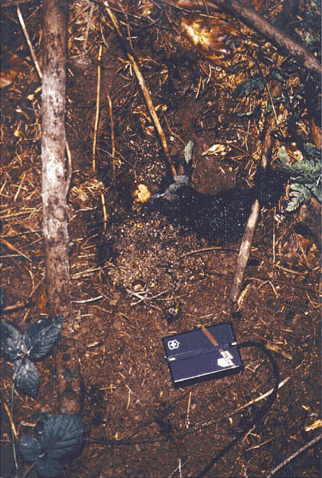 Fig. 6: A latrine with a single dung pit containing three different types of dung. To the right: dung containing mainly cherry pits; at the top: typical earthworm dung; ath the bottom: dung with bits of maize in it.